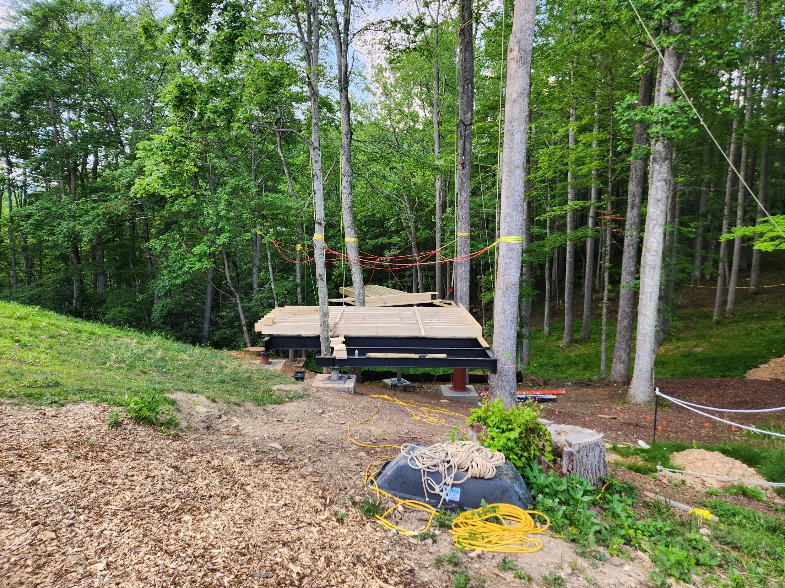 Our crew finished putting the floors into the Swallow’s Nest in mid June. Now, our owner is hand-painting each support beam (seen as red in the photo) to maintain the property’s wilderness vision. We want travelers to seamlessly glide from the Earth into the trees!